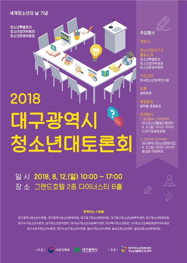 또한 한국청소년활동진흥원 이광호 이사장이 참석해 대구 청소년의 뜨거운 열정과 참여를 격려하고, 한국청소년정책연구원 최창욱 박사의 ‘청소년 참여 활성화’ 기조강연을 시작으로 20개 원탁 토론을 통해 총 10개의 청소년 정책이 제안될 예정이다.