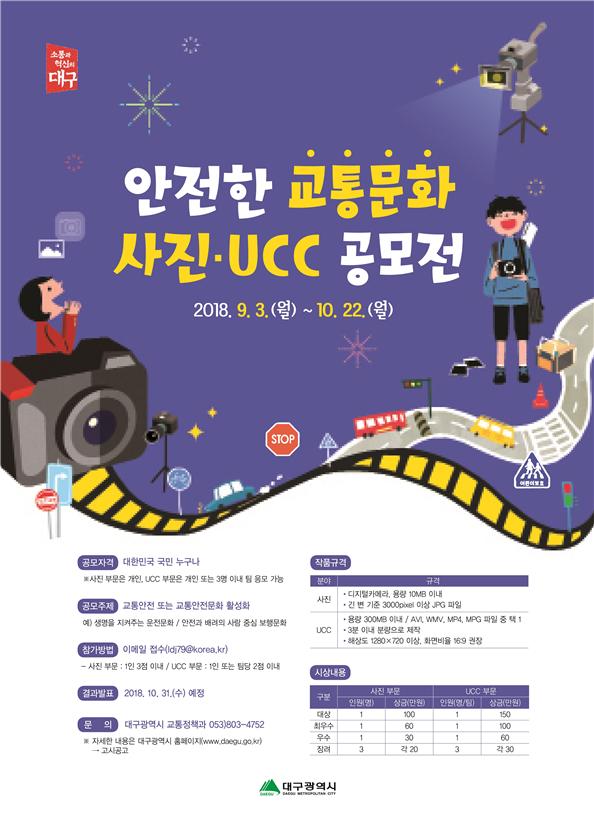 대구시는 시민들의 교통안전문화 활성화 참여를 유도하고, 시민들이 공감하는 교통안전 홍보를 강화하기 위해 오는 3일부터 10월 22일부터 ‘안전한 교통문화 만들기 사진․UCC 공모전’을 개최한다.